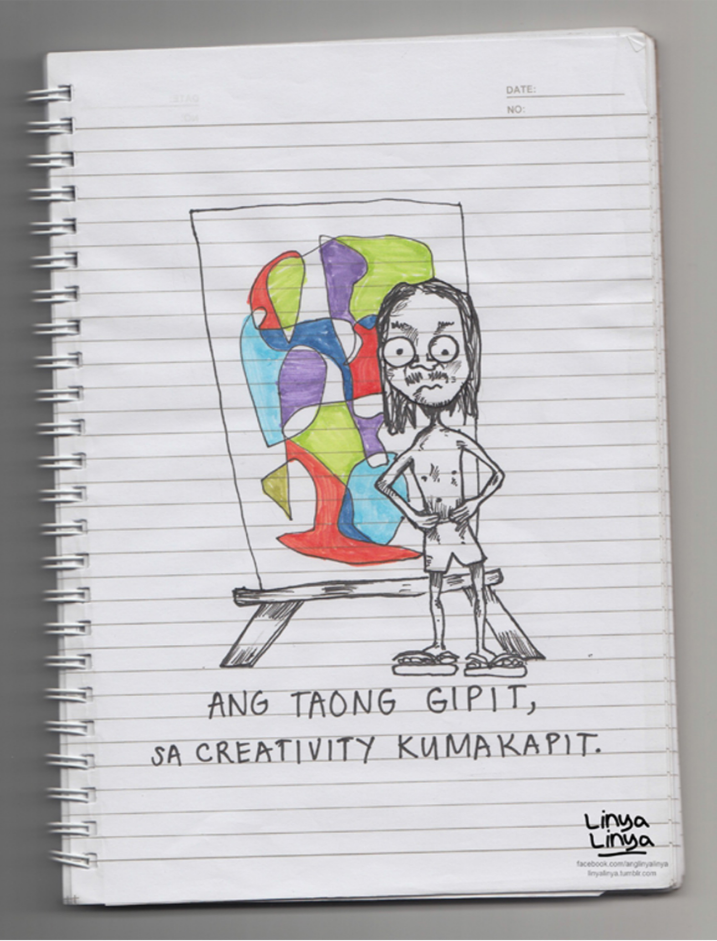 To address our creative slump, the solution was quite simple: go back to basics. Me, a class clown; Panch, a cartoonist who drew mischievous caricatures of his teachers. On a lined blank notebook, I wrote my one-liners, and Panch matched it with his doodles. We shared it online and the followers started piling up. It didn’t take long until our Linyas were turned into shirts and other products.